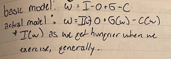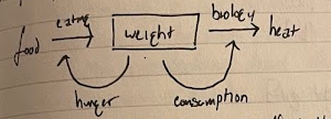 Given a person, we can convert their life into a basic energy balance. Dehumanizing, sure, but they will need to support biological activities with a caloric (or energy cost) of O, which is dissipated largely as heat (this is why people run at ∼98.6∘F and not ambient). To do so, one must consume at least an equivalent energy I in the way of food. These two alone suggest every individual eats exactly what they expend. Luckily, we store energy G in the way of glycogen, fat, and muscle, and may expend this later in the form C. Complicating this is that various processes within the body may detect these flows and vary the rate at which they expend energy accordingly.