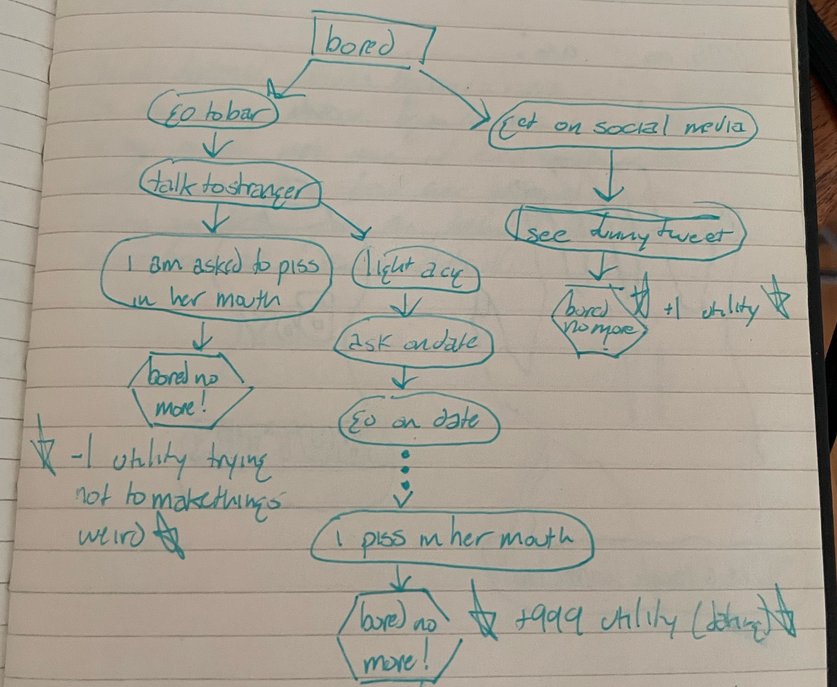 it is rare that one completely knows their own preferences; rather, they only know of the set that they’ve explored, which are oftentimes determined by their formative years. a common example is a dietary preference toward dairy, bread, and meat8 due to the fact that roasting vegetables in the oven seems to have been discovered by millenials in 2011 in the united states. it could genuinely be the case that one does not enjoy vegetables, but they will not know for sure unless they subject themselves to the prospect of feeling a minor pain.